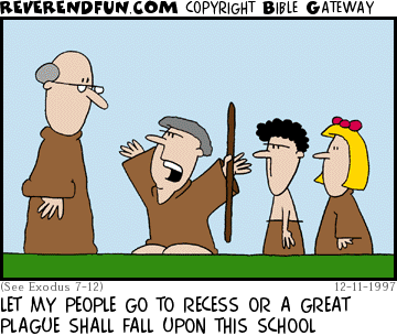 DESCRIPTION: Young boy with staff and arms raised talking to adult ... other kids standing nearby CAPTION: LET MY PEOPLE GO TO RECESS OR A GREAT PLAGUE SHALL FALL UPON THIS SCHOOL