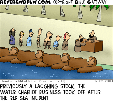 DESCRIPTION: Booth on beach in front of multiple pontoon-style water chariots CAPTION: PREVIOUSLY A LAUGHING STOCK, THE WATER CHARIOT BUSINESS TOOK OFF AFTER THE RED SEA INCIDENT