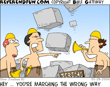 DESCRIPTION: Men with trumpets around the fallen walls of Jericho, some bricks going back up CAPTION: HEY ... YOU'RE MARCHING THE WRONG WAY