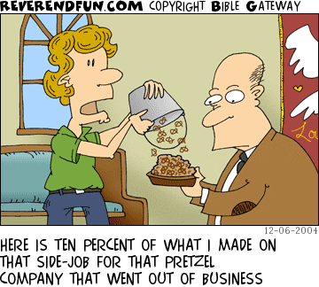 DESCRIPTION: Man pouring pretzels into the offering plate CAPTION: HERE IS TEN PERCENT OF WHAT I MADE ON THAT SIDE-JOB FOR THAT PRETZEL COMPANY THAT WENT OUT OF BUSINESS