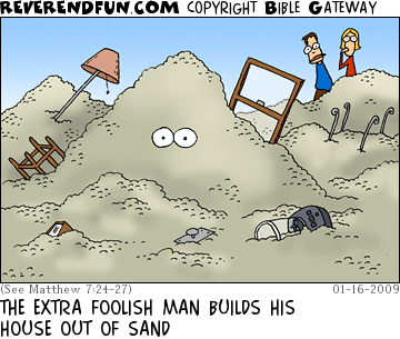 DESCRIPTION: Man in a pile of sand.  Household objects all about. CAPTION: THE EXTRA FOOLISH MAN BUILDS HIS HOUSE OUT OF SAND